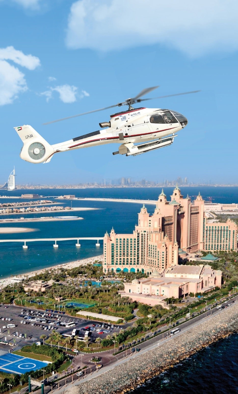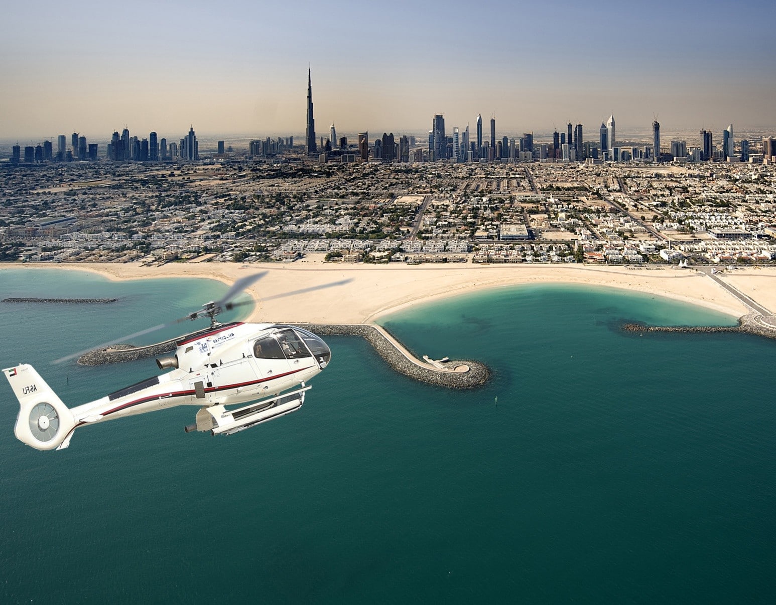 Dünyanın en uzun gökdeleni olan Burj Khalifa’yı 828 metrelik ihtişamıyla kuşbakışı inceleyebilir, yelken şeklindeki Burç Al Arab’ın görkemini havadan seyredebilirsiniz. Bunun yanı sıra mühendislik harikası Palmiye Adası’nın büyüleyici tasarımına yukarıdan tanıklık etmek benzersiz bir deneyim yaşamanıza imkan sağlar. Aquaventure Su Parkı’nın genişliğini ve tasarımını tepeden görmek de oldukça etkileyici olurken, Dubai kıyı şeridinin bembeyaz sahilleri ile turkuaz denizin birbiriyle uyumu adeta kartpostalları andırır.