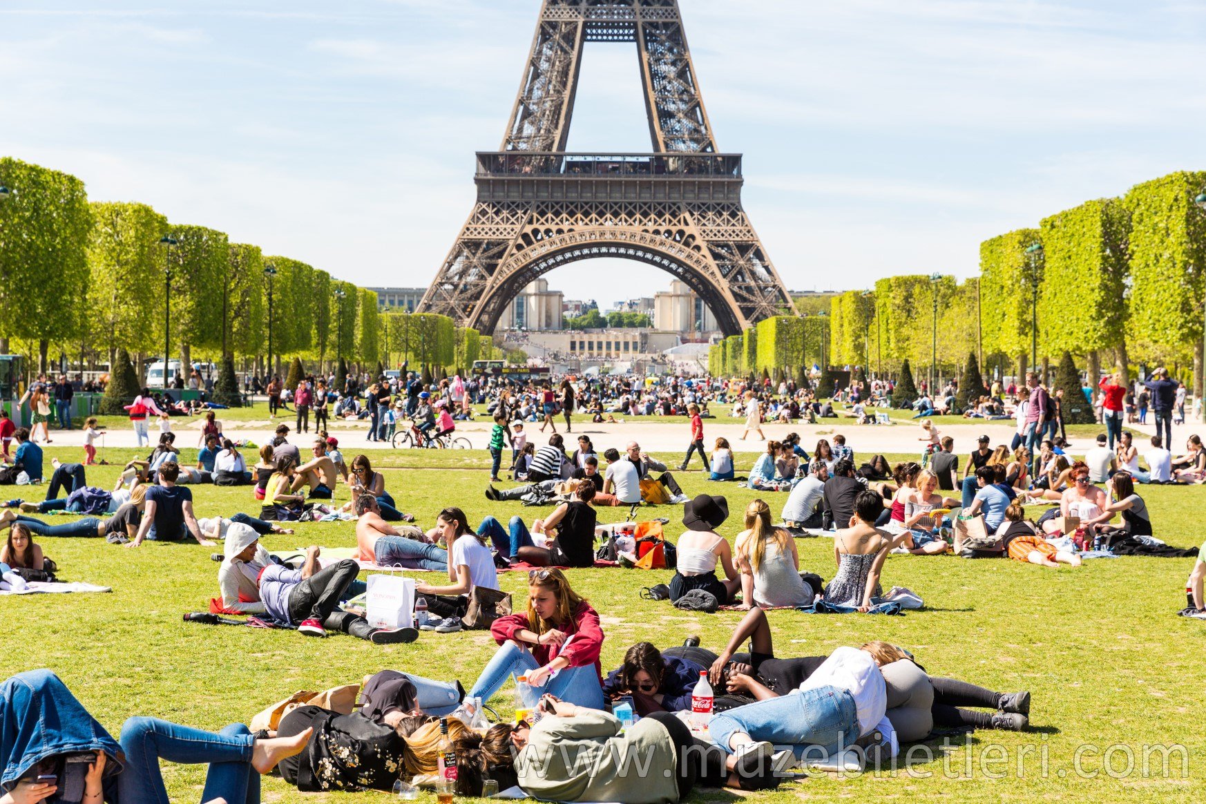Champ de Mars alanının Eyfel Kulesi’nin 3’üncü katından yani tepesinden görünümü. 2. Katı anlatırken bu alanın ikinci kattan çekilen görseline yer verdik, karşılaştırabilirsiniz.