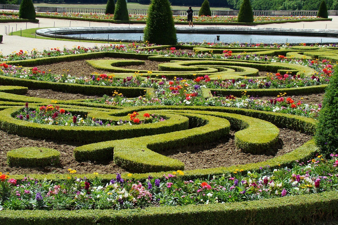 Geniş bir alanı kaplayan bahçe, saraya giden üç yol tarafından bölünüyor. Asıl dekoratif bahçe haç şeklindeki büyük kanalın arkasına yapılmış. Ağaçlar arasında gezdiğinizde heykellerle süslü çeşmeleri, çiçek panellerini görebilirsiniz. Geometrik şekilde olan çimler yüzyıllardır aynı şekilde kesiliyor. Çimenleri çevreleyen ağaçların hepsi aynı boydadır.