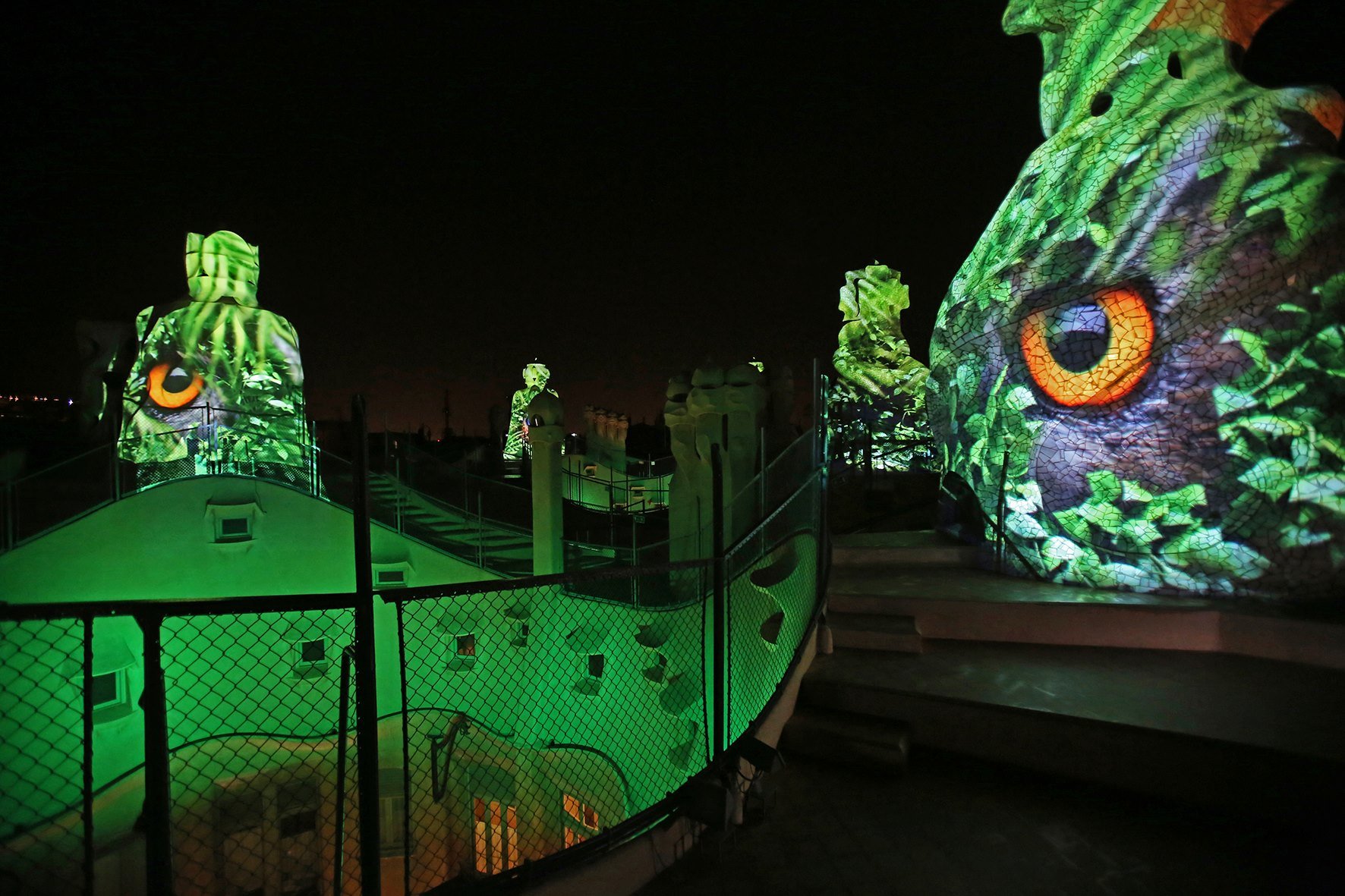 Çatıya çıktığınızda kendinizi Peri Bacalarında hissedebilirsiniz. Zemin düz değildir. İnişli çıkışlı patikalardan oluşuyor. Gaudi bacaları tasarlarken taşa dönüşen savaşçılardan esinlenmiştir. Bu taş savaşçılar binan koruyucuları olarak kabul ediliyor. Merdiven boşluğu kapakları da toprak, hava, ateş ve su gibi doğanın güçlerini tasvir ediyorlar. Çatı size 360 derece Barselona manzarası sunuyor.