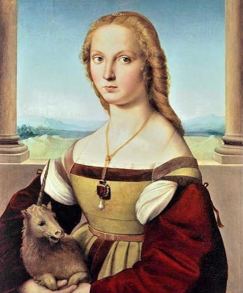 Unicorn, tek boynuzlu at demektir. 1506 yılına tarihlenen ve Raphael’e atfedilen bu eseri aslında Raphael yarım bırakmıştır, kadının kucağına önce köpek eklenmiş; daha sonra resimdeki bu köpek tek boynuzlu bir ata dönüştürülmüştür. Yani bu at resmin üçüncü safhasında resme ilave edilmiştir. İtalyanlar bu tespitleri uzun restorasyonlar ve röntgen sonucunda yapmışlardır.