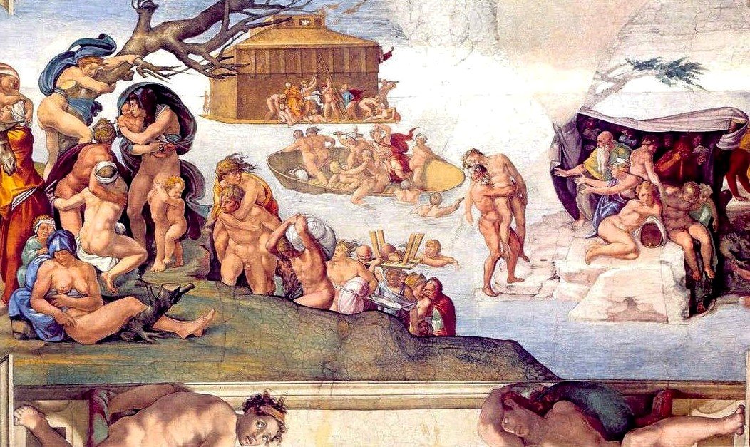 Freskin sağ tarafında, bir grup insanın bir barınağın altına girerek yağmurdan korunacak bir sığınak aradığını görüyoruz. Bir kişi boğulmuş oğlunu sırtlayarak çaresizce sığınağa götürmeye çalışıyor. Freskin sol tarafında ise gittikçe yükselen sudan kaçarak yükseklere ve ağaca tırmanan çaresiz insanları görüyoruz. Ortada ise ufak bir teknenin, batmak üzere olduğunu görüyoruz. En arka plana baktığımızda ise daha sakin bir tasvir içerisinde kurtuluş için Nuh’un Gemisi’ni inşa eden insanları görüyoruz.