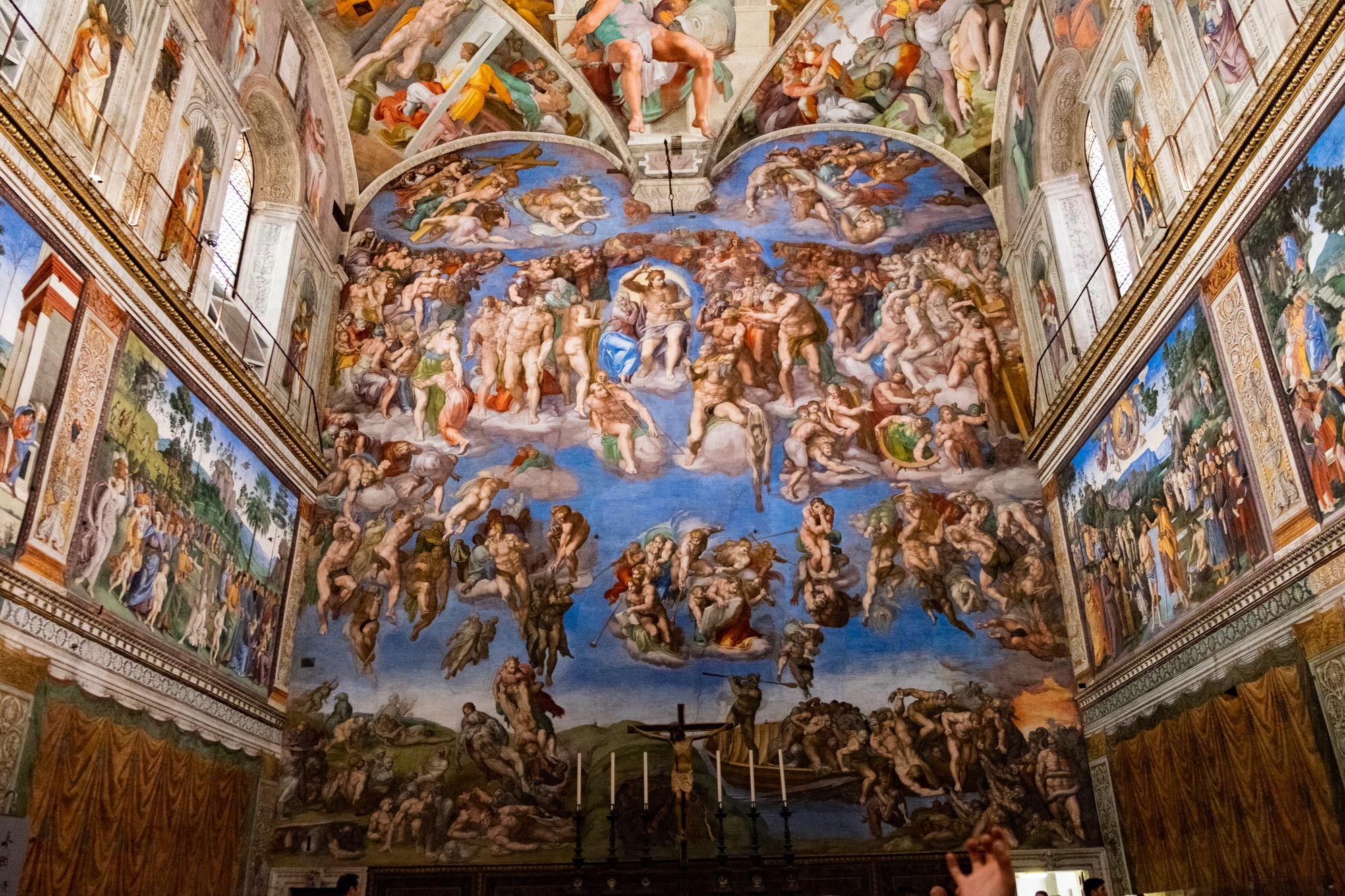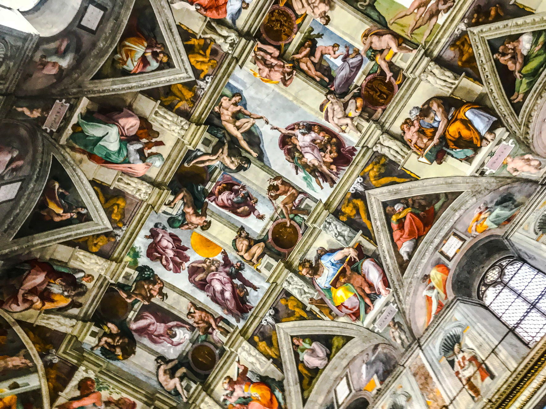 Evet değerli arkadaşlar, Sistina Şapeli’nin tavanını bitirdik. Tavanı incelerken dikkatinizi çekecektir, üçgen şeklinde dirsekler, üçgen şeklindeki dirsekleri tamamlar nitelikte dikdörtgen paneller ve onun altında yarım ay şeklinde gömme duvarlar yer almaktadır. Şimdi tavandan aşağıya doğru ineceğiz.