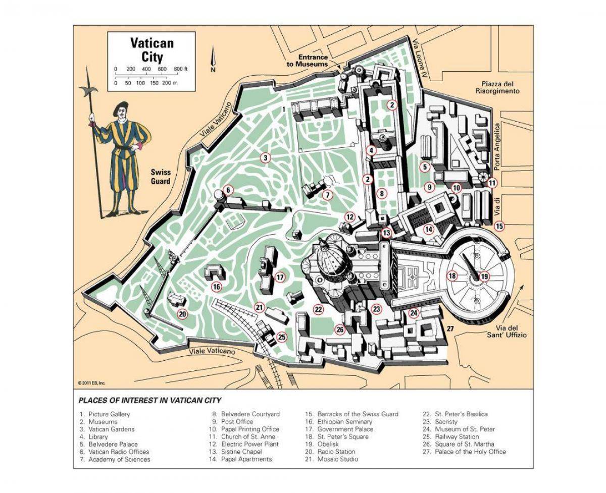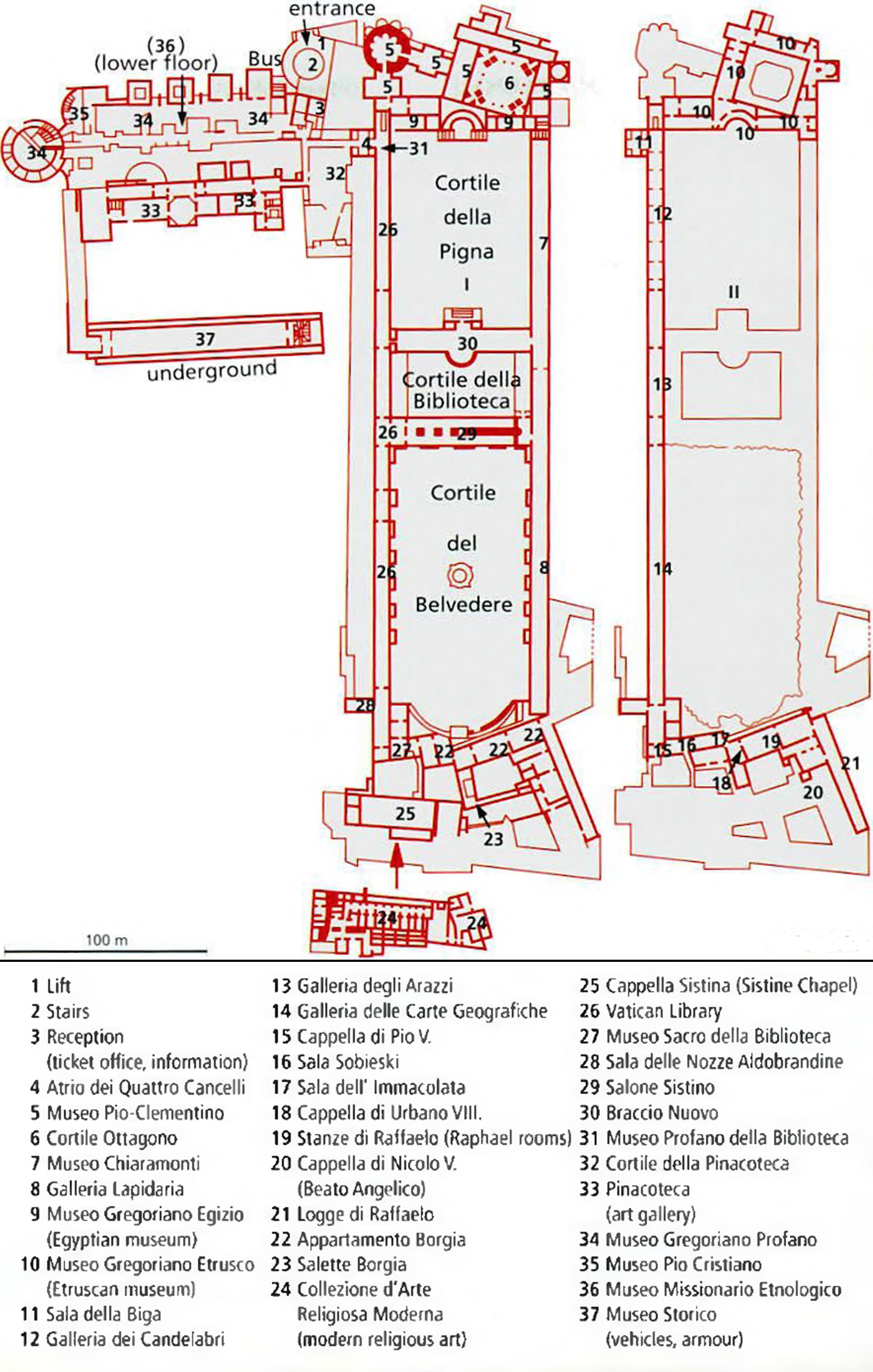 Vatikan Müzesi’nin bölümlerini Vatikan girişinde ücretsiz sunulan resmi haritadaki gezi planına uygun olarak sıralayıp anlattık. Vatikan Müzesi’nin bölümleri genel hatlarıyla aşağıdaki harita çalışmamızdaki gibidir: