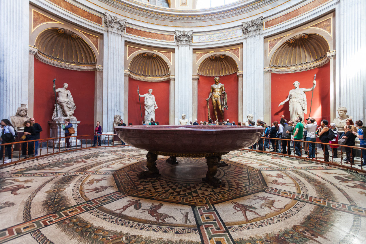 Ortada yer alan ve mozaik zeminin üstüne yerleştirilmiş devasa porfir mermerin, İmparator Neron’un sarayı olan Domus Aurea’nın kalıntılarında bulunmuştur. İmparatorun küveti olduğu düşünülmektedir. Antik Roma’nın limanı olan Ostia Antica kentinin hamamlarından getirilen mozaik zeminde Yunan mitolojisinde yarı insan yarı at bir yaratık olan Kentaurlar’ı göreceksiniz. Bu odada yani Round Room’daki heykeller benzersizdir.